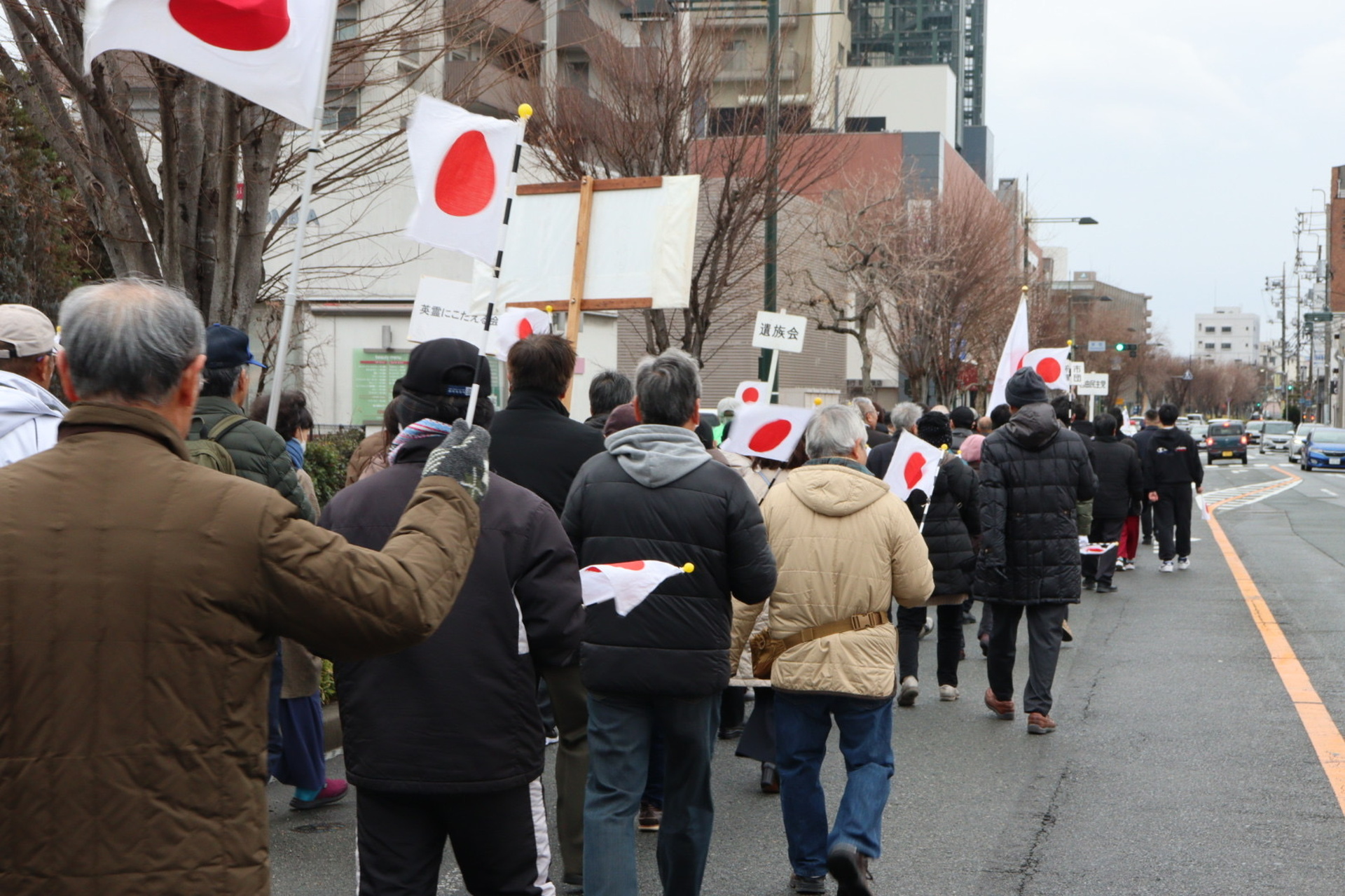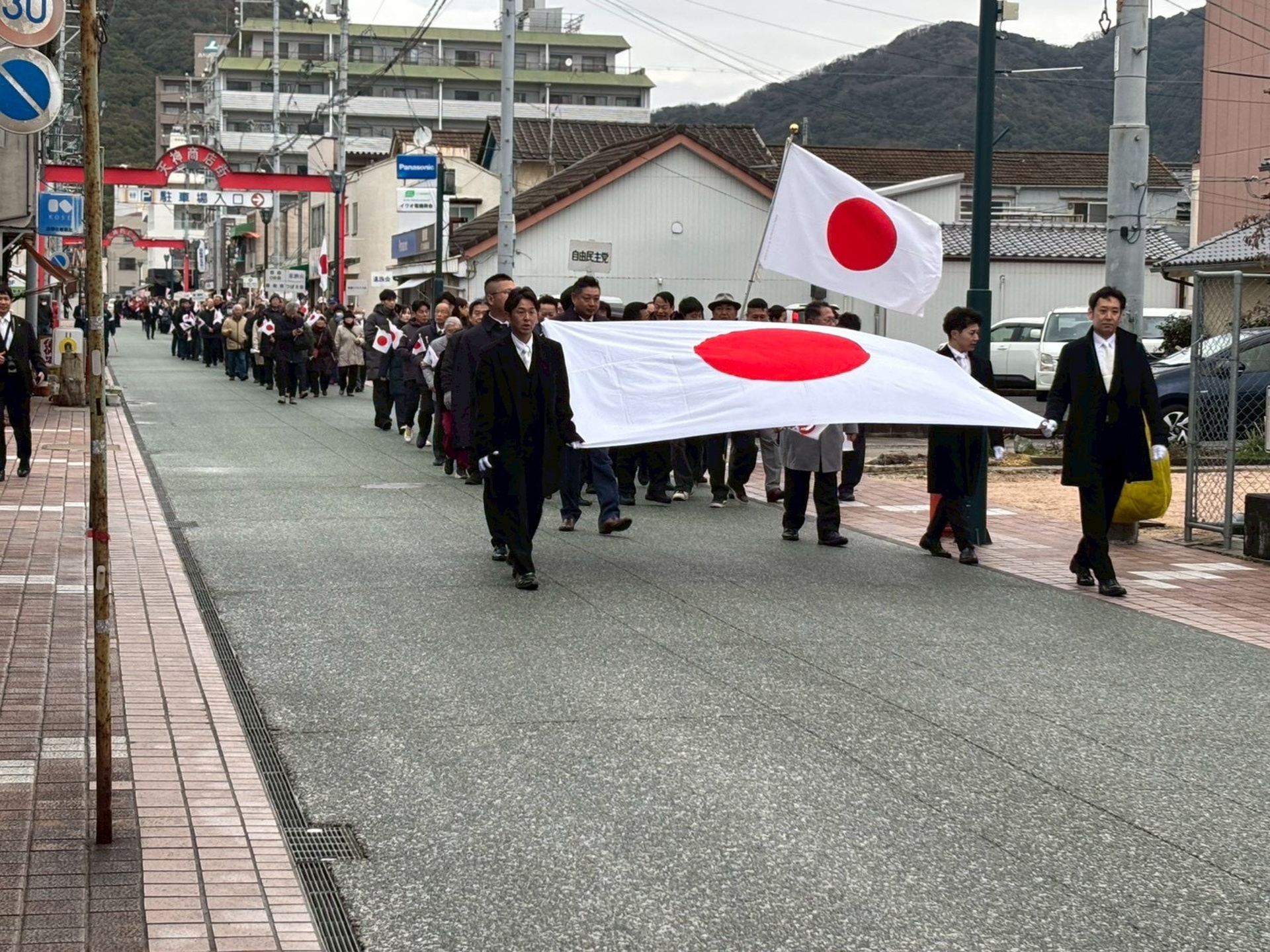 2月11日は、日本の建国を祝う『建国記念の日』(神武天皇が即位された日と伝えられている日)です。本年は、防府天満宮からアスピラートまで日の丸を掲げて行進し、その後、同会場にて式典を執り行いました。