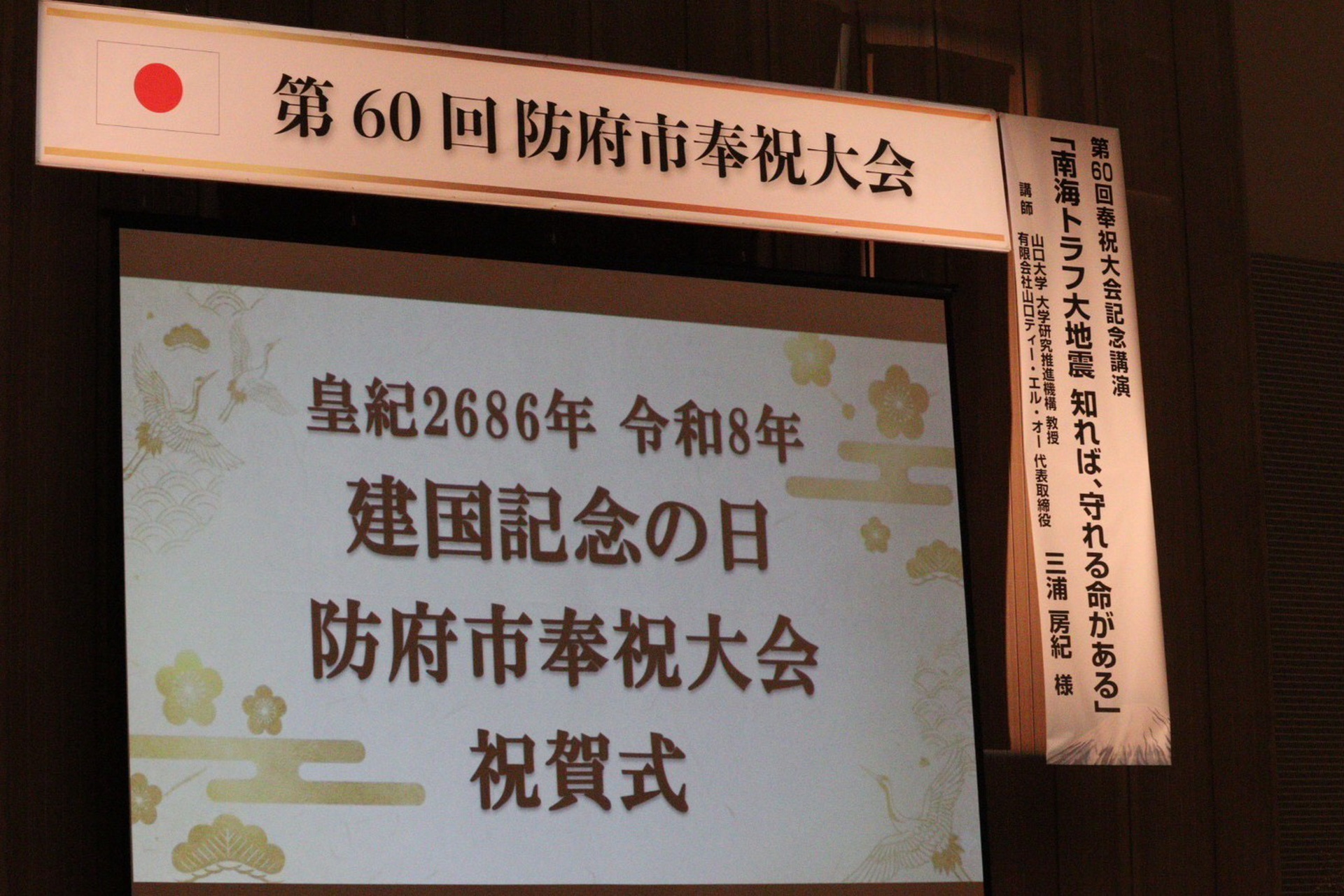本年度は、第60回防府市奉祝大会という節目の年にあたり、式典に加え記念講演会も開催いたしました。